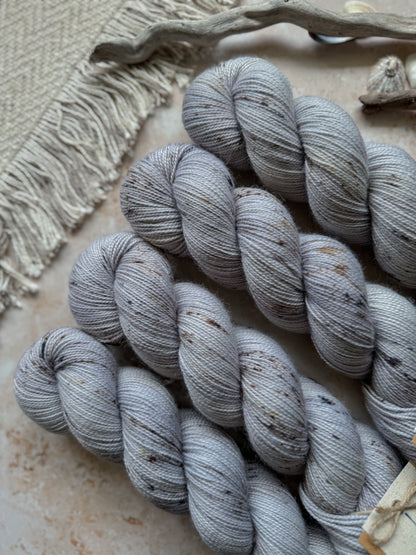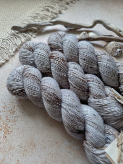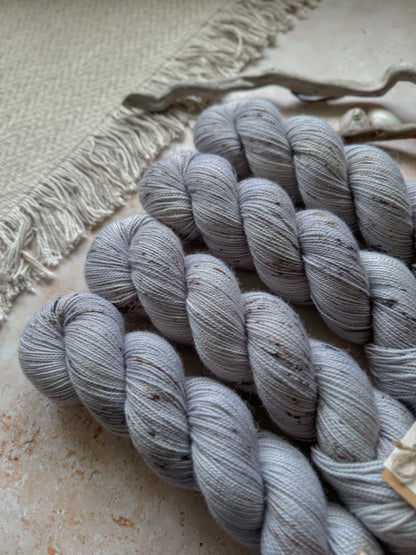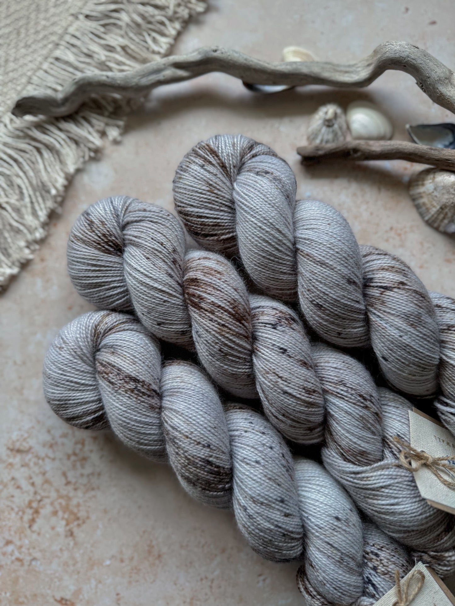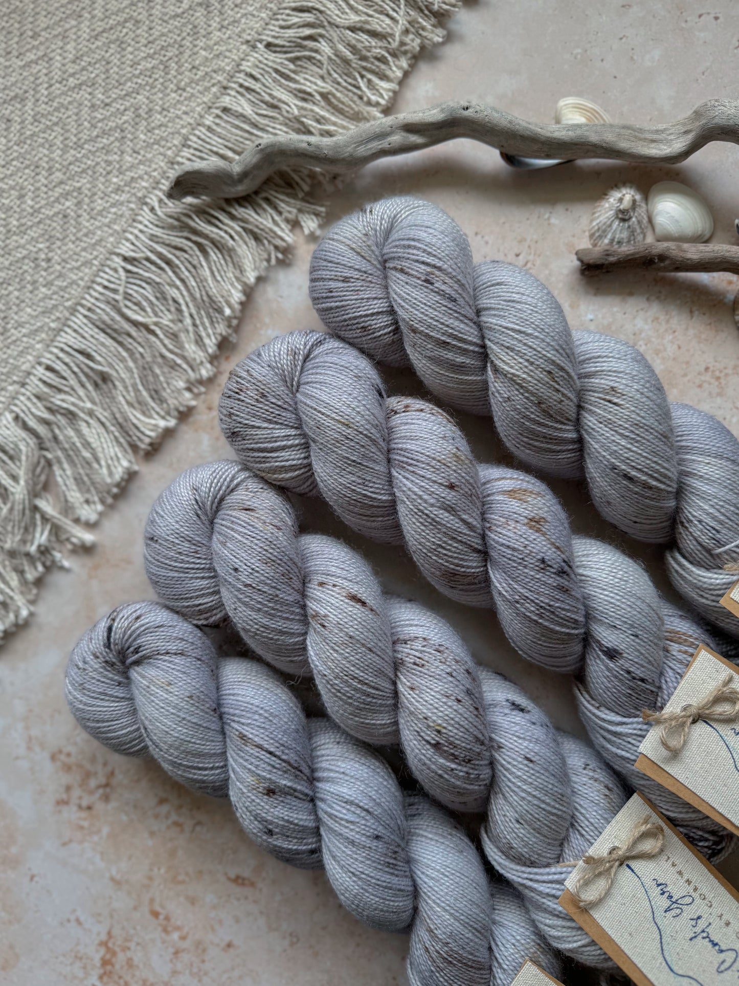 With this colourway we celebrate the way in which the sea shapes, etches and weathers our beachcombing finds. By Salt and Sea is a subtle off white which very slightly leans into blue/lilac tones, topped off with cool-brown and blue-grey speckles.