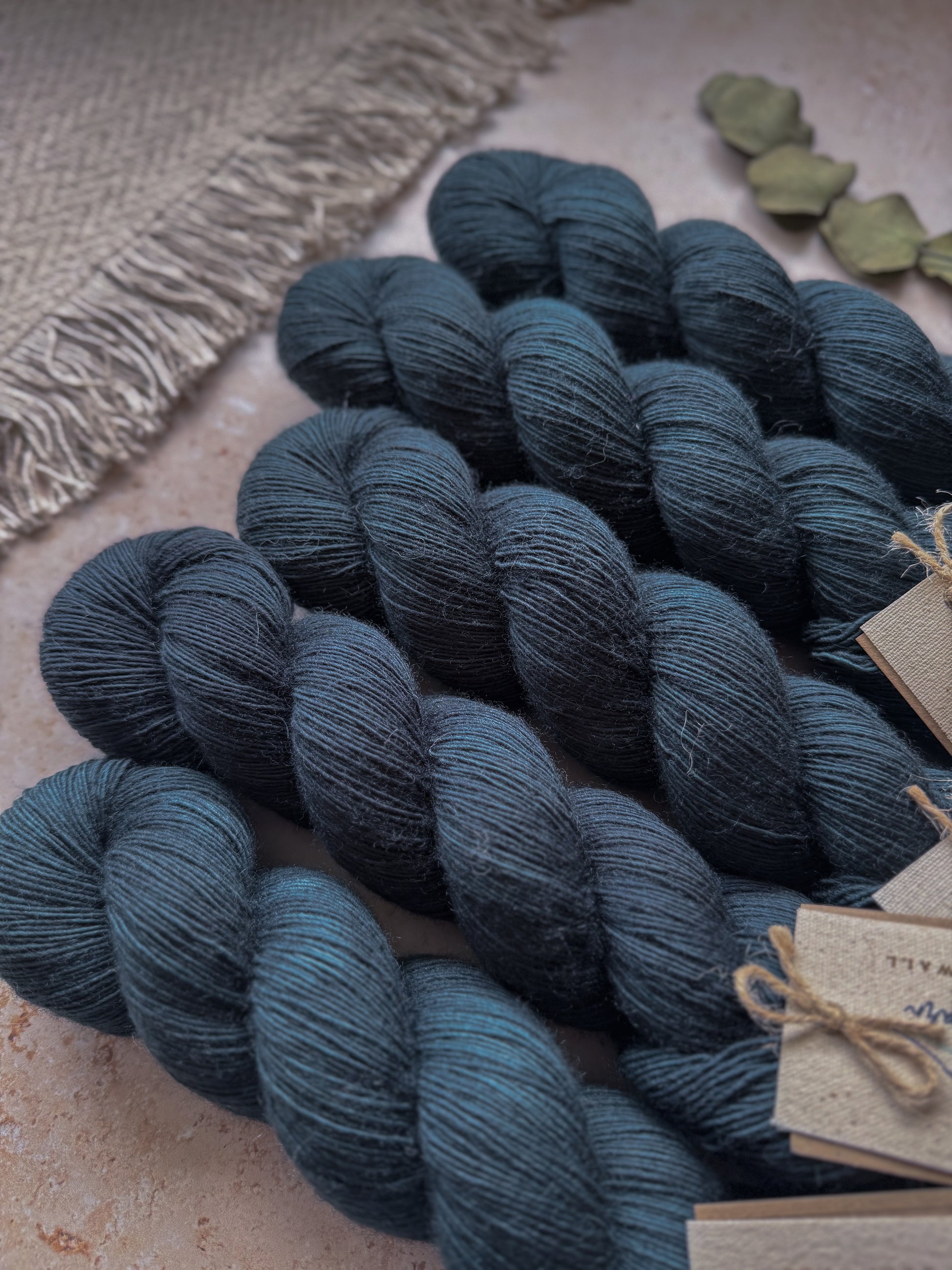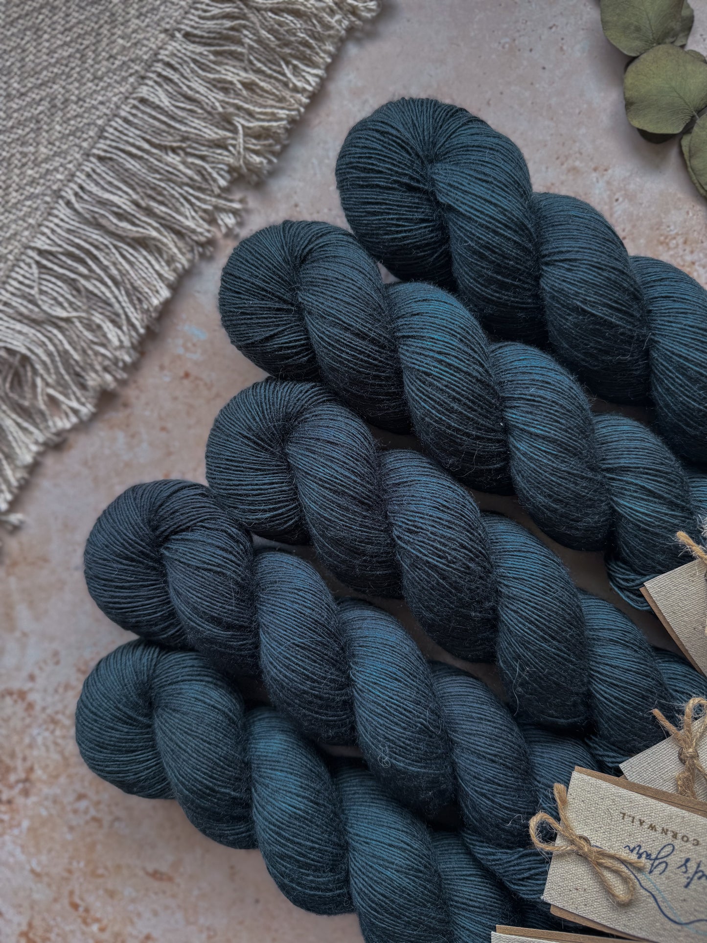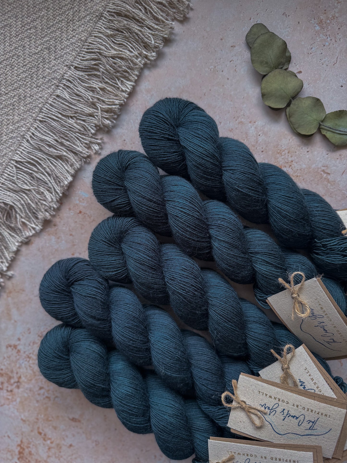 The opening line of this lovely old book was just asking to become a colourway name! To Behold The Sea is a beautiful deep blue, which looks beautifully dusky on our NSW bases!